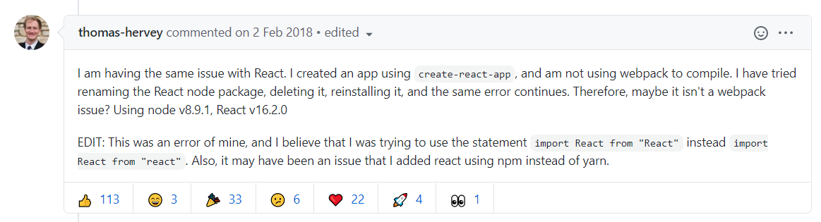 흔한 예로는 import React from 'react'; 를 React로 적어서 에러가 나는 경우인듯 하다.